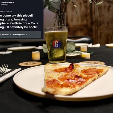 Guthrie Brewing Company (GBC), founded by two local Marine Corps veterans and Guthrie High alumni, is dedicated to revitalizing downtown Guthrie. GBC offers West Coast-style beers brewed in-house behind glass windows, a full bar with specialty drinks, and house-made pizzas with rotating weekly options. It's a welcoming space for families and adults 21+ to enjoy great food, drinks, and community.